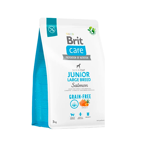 Nuestra receta Brit Care Dog Grain Free Junior Large Breed Salmón es un alimento super premium, formulado meticulosamente con salmón y patatas, ideal para cachorros con sensibilidades digestivas o que requieren un cuidado especial en el pelaje. Es la elección profesional para quienes buscan un desarrollo esquelético y cognitivo perfecto.